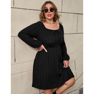 Coolmee Women's Plus Size Sweater Dresses Ribbed Knit Solid Color with Pockets Dresses Casual Square Neck Tie Bow Long Sleeve Dresses 4XL Black