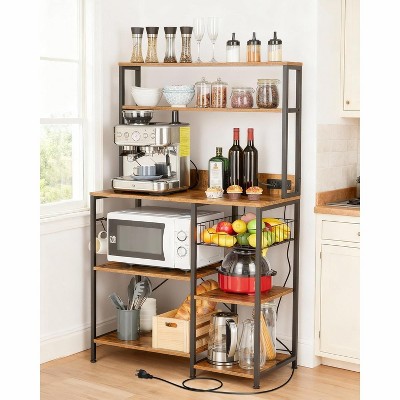 Kitchen Bakers Rack with Power Outlet,4-Tier Microwave Oven Stand&Coffee Bar Table (6 S Hooks) | Rustic Brown Kitchen Storage Shelf for Spices,Pots