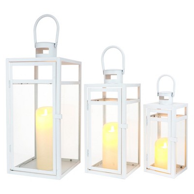 HomeRoots Set of Three Clear And White Glass And Metal Floor Lantern Candle Holders