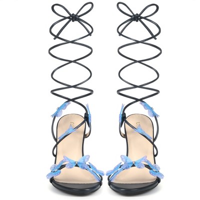 BLISSFUL STEP Butterfly Strappy Heels Rhinestone Lace Up Chunky Heel Sandals for Women