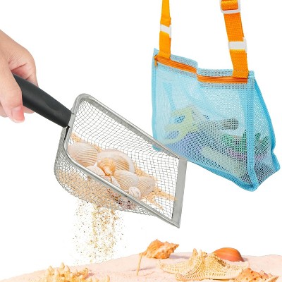 4E's Novelty Shark Tooth Sifter for Beach with Small Mesh Beach Bag for Shell Collecting, Metal Sand Scoop for Picking Up Shells