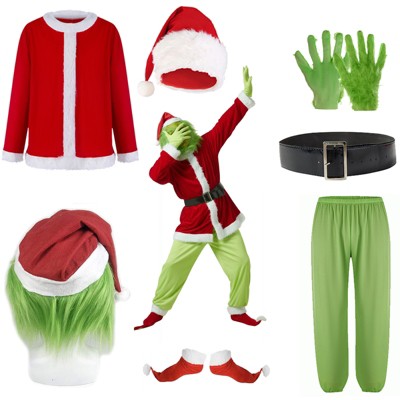Aoibox Adult Deluxe 7-Piece Green Monster Santa Suit - Christmas Outerwear with Scary Mask, Unique Holiday Cosplay Costume