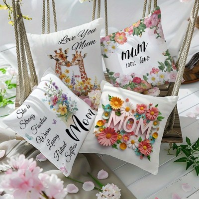 Lomsoe 4pcs Happy Mother's Day Floral Decorative Pillow Covers Set - 18x18 Inch Washable Polyester for Indoor/Outdoor Sofa, Porch, Living Room.