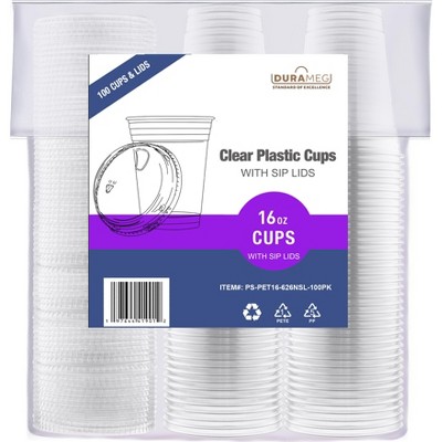 Durameg Large Party Plastic Cups with Strawless Sip Lids 16 oz 100 Count - Crystal Clear Disposable Cups