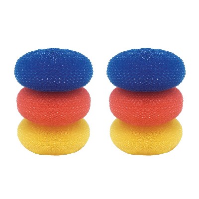 LOLA Plastic Mesh Non-Scratch Scouring Pad, 6 Pack, Hand Saving Comfort Knob, Red, Blue or Yellow It's Random, Clean Pots, Pans, Sinks