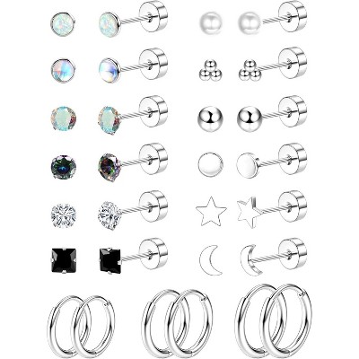 18 Pairs Hypoallergenic Stud Earrings Set: Star, Moon, Heart & Opal Designs, 20G Flat Back for Cartilage