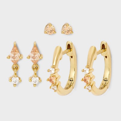 14K Gold Dipped Cubic Zirconia Stud Earring Set 3pc - A New Day™