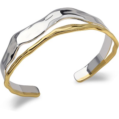 Sterling Silver Two Tone Open Bangle Double Layer Irregular Wave Hammered Texture Bracelet
