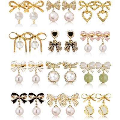 SmallRig 12 Pairs Bow & Pearl Dangle Earrings, Rhinestone Dainty Jewelry for Wedding & Party