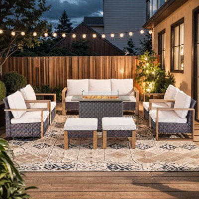 LayinSun 9 Pieces Rope Woven Patio Furniture Set, Modern Modular Sectional Sofa with Fire Pit Table and Upgrade Thickness Cushion