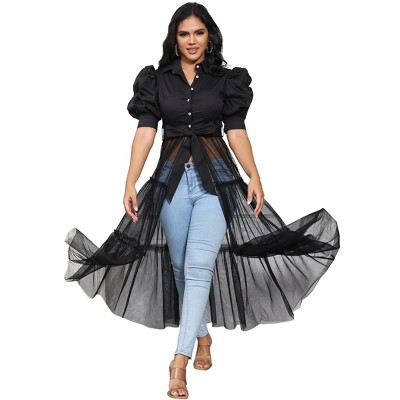 Clearlove Womens Mesh See Through Shirts Puff Sleeve Long Dresses Belt V Neck Button Down Flowy Ruffled Casual Club Party Outfit