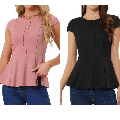 INSPIRE CHIC Women's Elegant Round Neck Cap Sleeve Solid Color Peplum Blouses 2 Packs