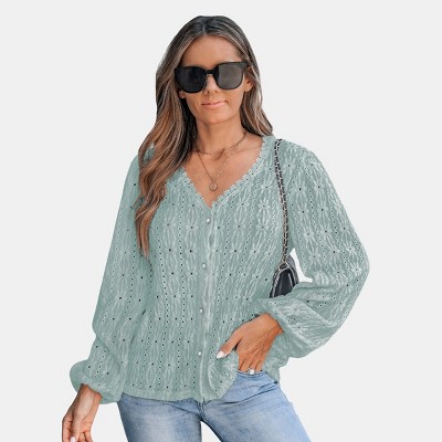 Women's Mint Green Crochet Lace Button-Up Blouse - Cupshe
