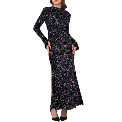 INSPIRE CHIC Women's Sequined Maxi Velvet Crewneck Long Sleeve Cocktail Evening Bodycon Dress