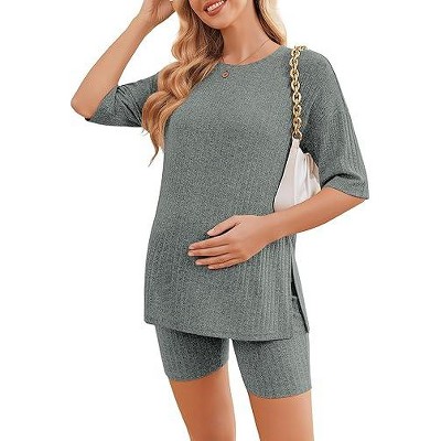 Ekouaer Women Maternity Sets 2 Piece Outfits Short Sleeve Shirts and Biker Shorts Pregnancy Loungewear Mama Clothes