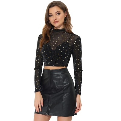 INSPIRE CHIC Women's Mesh Crop Stars Mock Neck Party See Through Blouse