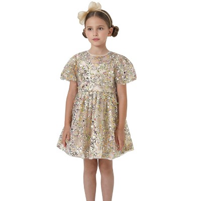 2Bunnies Girls' 2T-8Y Gold Shimmer Sparkle Sequin Puff Sleeve Holiday Party Birthday Girl Dress