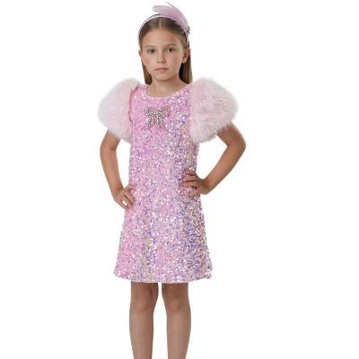 2Bunnies Girls' 4T-10yr Sparkly Two-Tone Contrast Sequin Dress with Faux Feather Sleeves