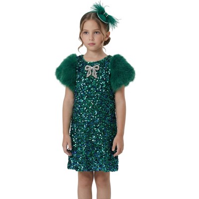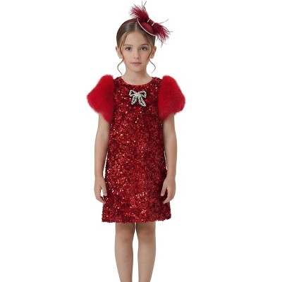 2Bunnies Girls' 4T-10Y Fur Puff Sleeve Velvet Sequin Holiday Party Birthday Girl Dress