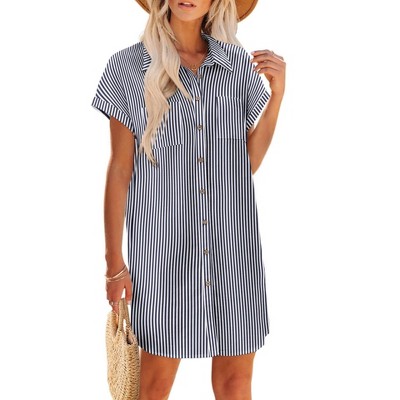 Womens Fall Dress Stripe Ruffle A Line Elbow Sleeve Shirtdress Ruffle Placket Mock Neck Mini Dress Lantern Sleeve Casual Highwaist Dress