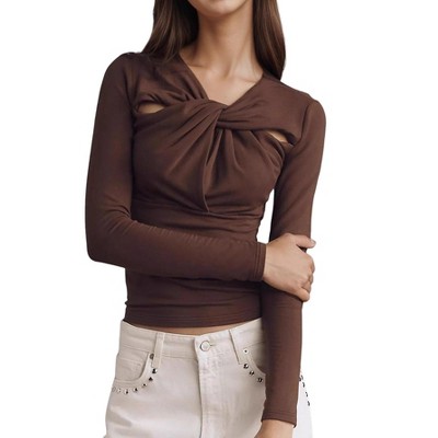 Coolmee Women Long Sleeve Cutout T-Shirts Twist Front Slim Fitted Crisscross V Neck Sexy Going Out Tops