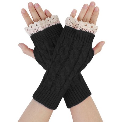 Unique Bargains Pair Women's Winter Lace Trim Fingerless Thumbhole Stretchy Knitted Gloves