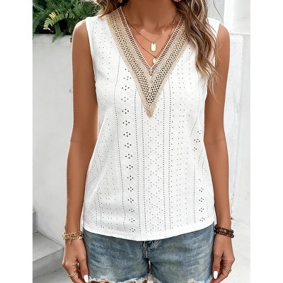 Women's V Neck Lace Sleeveless Top Hollow Out Casual Summer Tank Top