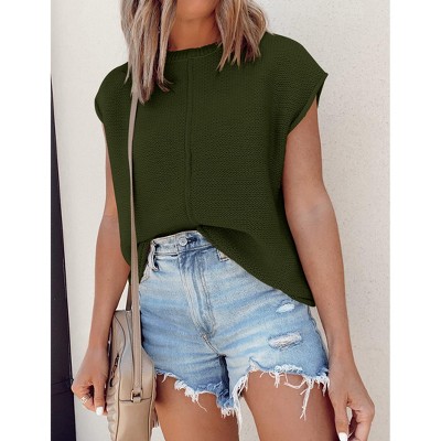 Womens Summer Cap Sleeve Tops Trendy Casual Crew Neck Knit Lightweight Sweater Pullover Top