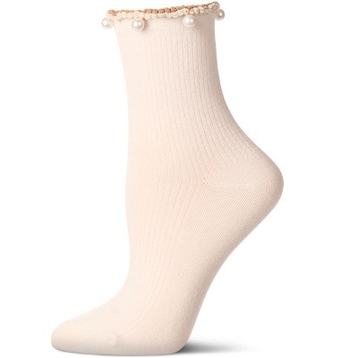 Memoi Women's Cotton Rich Faux Pearl Trimmed Lettuce Edge Ankle Sock