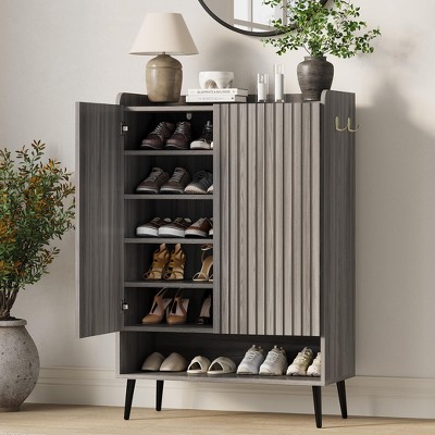 Fluted Shoe Cabinet with Door & Open Shelf, Freestanding Shoe Storage Organizer with Hooks for Entryway, Hallway
