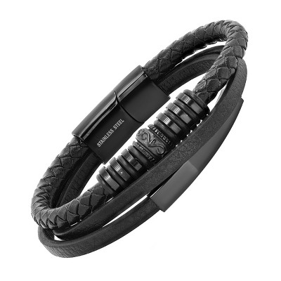 Steeltime Men's black layered braided leather and black ip stainless steel Id bracelet