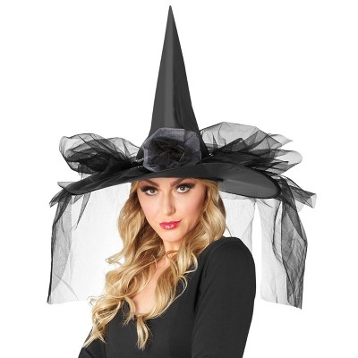 Adults Black Poiyester Witch Hat with Feathers, Spider Bling & Net Veil Costume Accessory