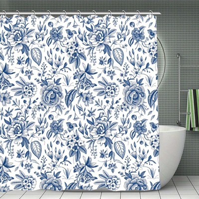 Boho Blue Floral Linen Shower Curtain- Rustic Farmhouse cottagecore Print Pattern Botanical Boho Shower Curtain Set 70.8x70.8Inch