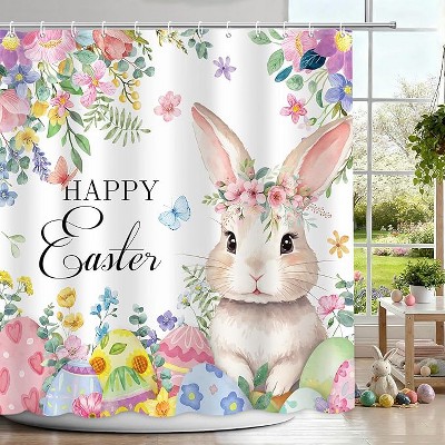 Easter Shower Curtain, Cute Colorful Spring Bunny & Egg Bathroom Shower Curtain, Funny Bathroom Decor 70.8x70.8 Iniches