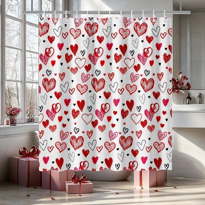 Nertpow 1PC Valentines Shower Curtain Doodle Style Red Pink Black Heart Bathroom Shower Curtain Waterproof Fabric Curtain Decor with 12 Hooks.
