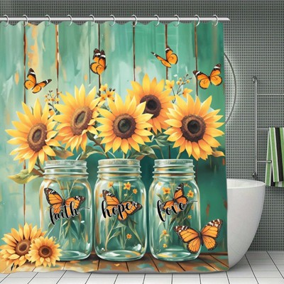 Yellow Sunflower Shower Curtain, Farmhouse Floral and Butterfly Rustic Green Wooden Fabric Inspirational Restroom Decor Accessories 70.8x70.8Inch