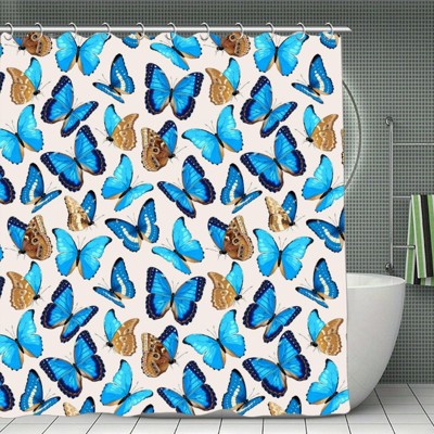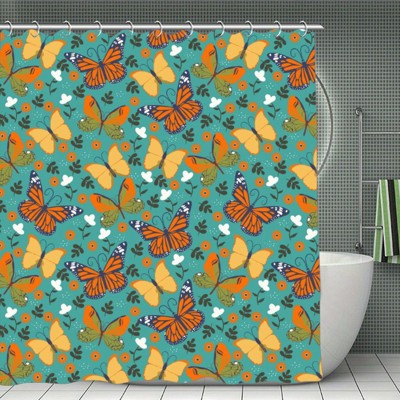 Soscooter Monarch Yellow Butterfly With Green Foliage Small Flower Pattern Polyester Shower Curtain For Bath Tub Shower Bathroom 70.8x70.8Inch