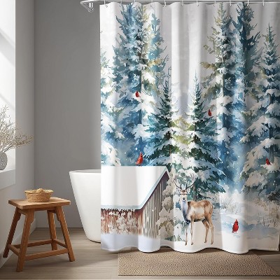 Christmas Deer Shower Curtain with Cardinal Birds and Snow Cottage ¨C Winter Forest Snow Scene Bath Curtain 70.8x70.8 Inch
