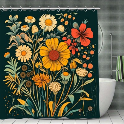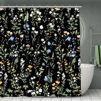 Boho Floral Shower Curtain with Tassels, Black Botanical Wildflower Flower Tassel Shower Curtain for Bathroom Waterproof Fabric Set 70.8x70.8Inch