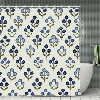 Boho Floral Shower Curtain with Tassels, Block Print Blue Flower Tassel Shower Curtain for Bathroom Waterproof Fabric Set 70.8x70.8Inch