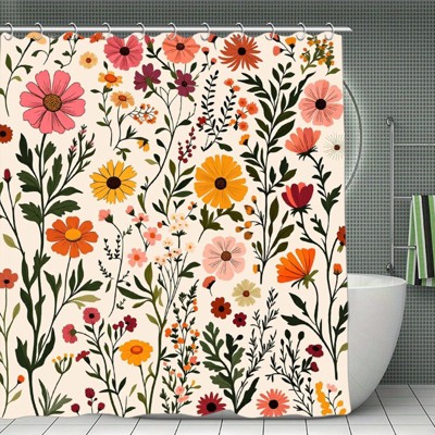 Boho Floral Shower Curtain with Tassels, Wildflower Beige Botanical Flower Tassel Shower Curtain for Bathroom Waterproof Fabric Set 70.8x70.8Inch