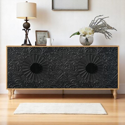 BAOURE Carved 4-Door Sideboard Buffet Cabinet, Modern Natural Coffee Bar with Adjustable Shelf, Gold Accent Storage for Living Room & Dining Room