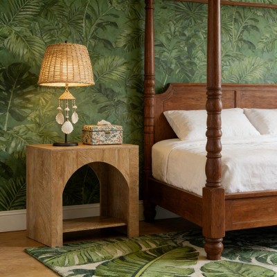 SUGIFT Rattan Side Table Bamboo Accent Bedside Table with Tempered Glass Top Black