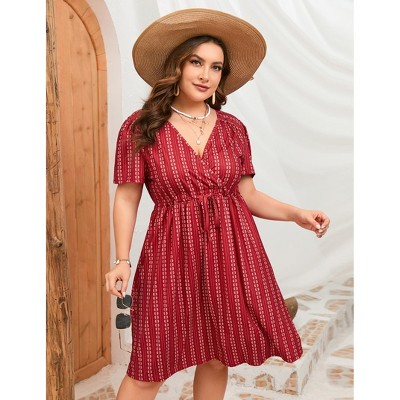 Plus Size Women's V-Neck Midi Dress - Short Sleeve, Wrap Waist with Belt, Flowy Pleated Skirt