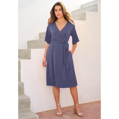 24seven Comfort Apparel Plus Size Navy Print Short Sleeve Knee Length V Neck Wrap Dress