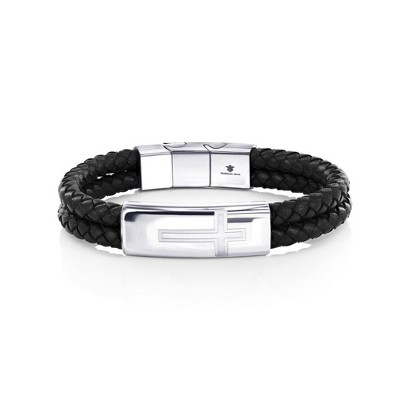 Metallo Mens Black & Silver Stainless Steel with Genuine Black Leather Bracelet - Black - 8.5 Inch