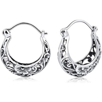 Sterling Silver Vintage Filigree Hoop Earrings - Floral Heart Clip-On Huggies, Lightweight Christmas Gift