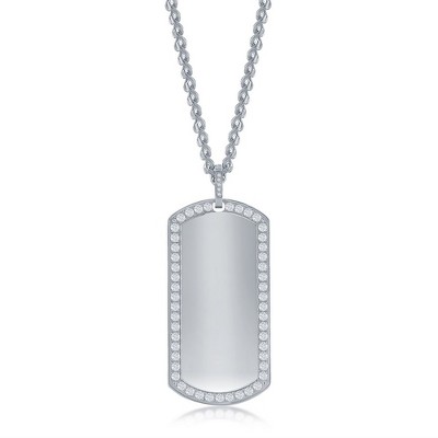 Metallo Mens Stainless Steel CZ Dog Tag ID Necklace - Silver - 24 Inch