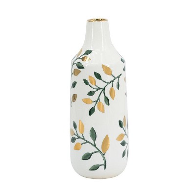 HomeRoots 12" White Green And Gold Floral Leaf Bud Ceramic Table Vase