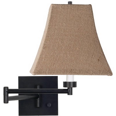 Franklin Iron Works Modern Swing Arm Wall Lamp Espresso Plug-In Light Fixture Natural Burlap Square Shade Bedroom Bedside Reading